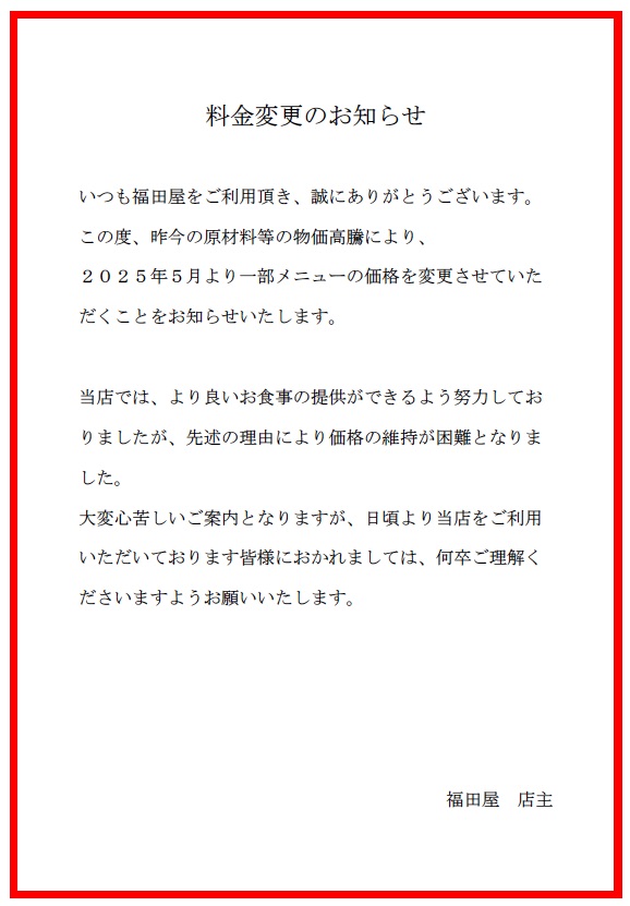 いつも福田屋をご利用いただき誠にありがとうございます。